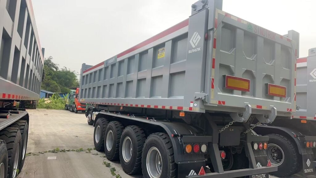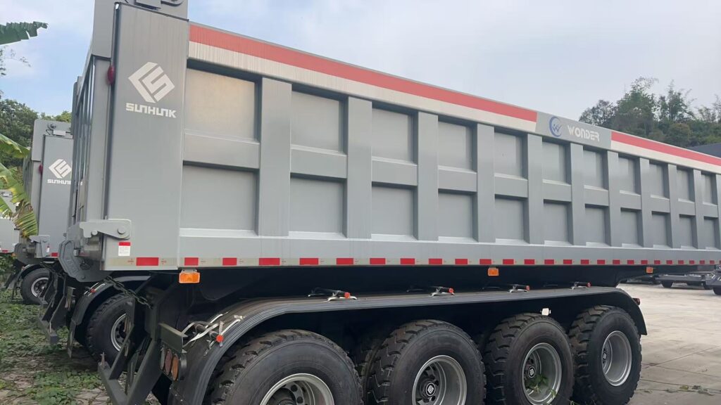 Dump semi-trailer is driven by a hydraulic system to achieve autonomous unloading of the cargo compartment, mainly including side-over and rear-over two operation modes. Its cargo compartment adopts manganese plate welding process, equipped with non-independent steel plate stamping rigid suspension system, can complete sandstone, coal and other bulk materials dumping operations within 30 seconds to 2 minutes, residual rate lower than traditional models